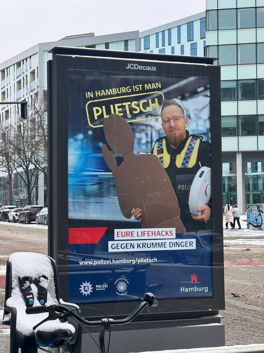 Mit der Präventionskampagne „In Hamburg ist man Plietsch“ beschreitet die Polizei Hamburg ebenfalls einen neuen Weg. Informierte die Polizei ihrerseits bisher die Bürgerinnen und Bürger mit ihren Präventionsaktionen über eine Vielzahl von Möglichkeiten zur Verbrechensverhütung, rief sie dieses Mal mit Unterstützung verschiedener Kooperationspartner die Bevölkerung auf, ihr individuelle praktische Tipps und Tricks, sog. Lifehacks, zum Schutz vor Straftaten zuzusenden. Die Vielzahl an Einsendungen ist Beleg für die gesellschaftliche Relevanz und das hohe Interesse an dem Thema. Im Rahmen des Medientermins wurden die vier Top-Einsendungen, die dem Einbruchs- und Diebstahlsschutz dienen, mit jeweils 250€ belohnt.