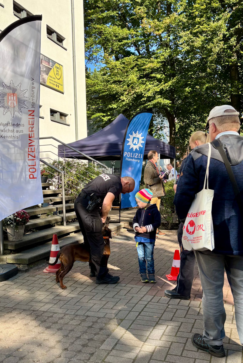 So konnte ein Funkstreifenwagen der Polizei – inklusive Probesitzen – bestaunt werden und auch ein Polizeimotorrad wurde präsentiert. Die angebotenen Führungen durch die Wache sorgten fortlaufend für großen Andrang. Die Diensthundestaffel stellte ihre Schutzhunde mit eindrücklichen Showeinlagen vor, Personenspürhund „Jutta“ lief auf dem Gelände umher und zauberte Groß und Klein ein Lächeln ins Gesicht. Die freiwillige Feuerwehr Wilhelmsburg war mit ihrem Löschfahrzeug (HLF) vor Ort und auch Beamtinnen und Beamte des Zolls gewährten Einblicke in ihren Arbeitsalltag.