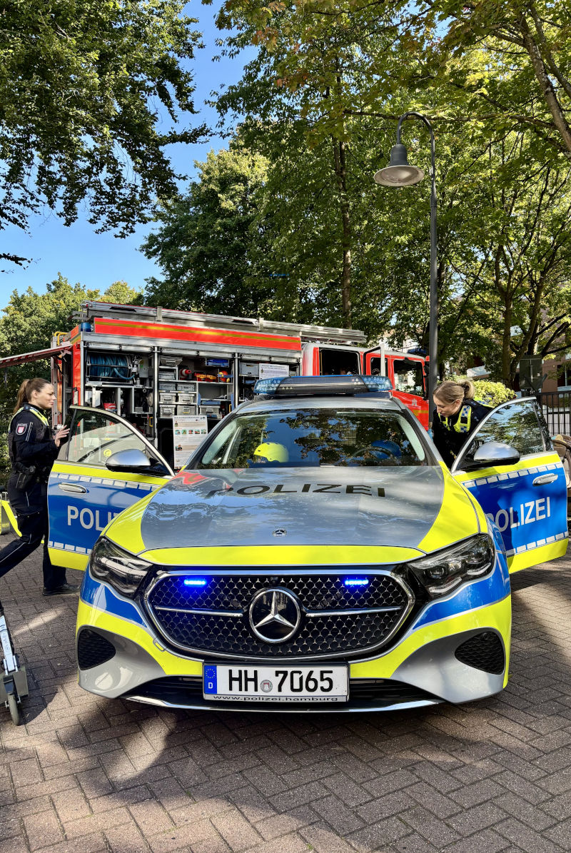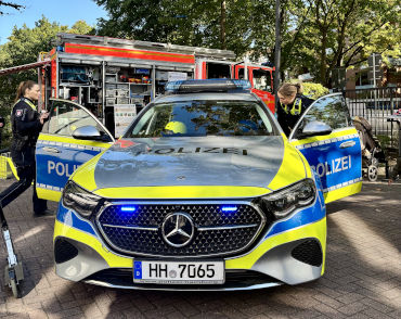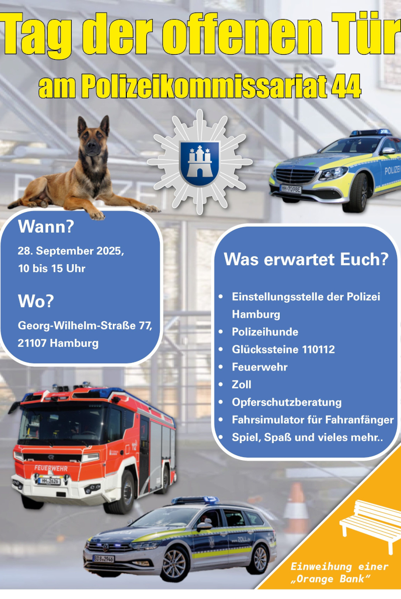 So konnte ein Funkstreifenwagen der Polizei – inklusive Probesitzen – bestaunt werden und auch ein Polizeimotorrad wurde präsentiert. Die angebotenen Führungen durch die Wache sorgten fortlaufend für großen Andrang. Die Diensthundestaffel stellte ihre Schutzhunde mit eindrücklichen Showeinlagen vor, Personenspürhund „Jutta“ lief auf dem Gelände umher und zauberte Groß und Klein ein Lächeln ins Gesicht. Die freiwillige Feuerwehr Wilhelmsburg war mit ihrem Löschfahrzeug (HLF) vor Ort und auch Beamtinnen und Beamte des Zolls gewährten Einblicke in ihren Arbeitsalltag.